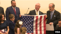 Një flamur që valoi një ditë mbi kupolën e Kongresit amerikan, i’u dhurua veprimtarit shqiptaro-amerikan, Harry Bajraktari.