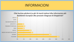Një gjetje tjetër me rëndësi është pohimi masiv i të anketuarve se ata informohen mbi Bashkimin Europian dhe procesin integrues të Shqipërisë vetëm nga mediat; mbi 30 për qind nga televizioni, nën 30 për qind nga interneti dhe afro 20 për nga radio dhe gazetat.