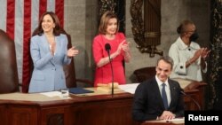 Duke e ftuar atë në podium për fjalimin, Kryetarja e Dhomës së Përfaqësuesve, Nancy Pelosi vuri në dukje "lidhjen e palëkundur" mes dy vendeve duke thënë se themeluesit e Shteteve të Bashkuara u mbështetën në idealet e lashta greke të lirisë dhe demokracisë. "Vendet tona janë aleatë kryesorë në skenën botërore," tha Pelosi.