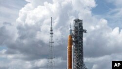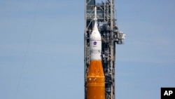 Raketa 98 metra e gjatë - më e fuqishmja e ndërtuar ndonjëherë nga NASA - mbetet në platformën e saj në Qendrën Hapësinore Kennedy, me një kapsulë ekuipazhi të zbrazët.
