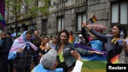 Qindra mbështetës të paradës së Krenarisë u mblodhën nën shiun e rrëmbyer, duke kërcyer dhe kënduar.