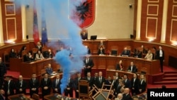 Atëherë zonja Nikolla nisi procesin e votimit, ndërsa një grup deputetësh të opozitës protestuan edhe sot me përmbysje karrigesh dhe ndezje flakadanësh.