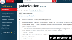 Në fjalorin Merriam-Webster fjala "polarizim" ka përkufizime shkencore dhe metaforike. Ajo më së shpeshti përdoret për të theksuar "mosmarrëveshjet e forta midis fraksioneve ose grupimeve kundërshtare". Kompania amerikane Merriam-Webster, e cila merr 100 milionë klikime në muaj në faqen e saj të internetit, zgjedh fjalën e vitit bazuar në të dhënat, vëzhgimin e rritjes së kërkimeve dhe përdorimit të saj.