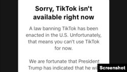 Rrjeti TikTok, i cili është në pronësi të ByteDance të Kinës, u tha përdoruesve që përpiqeshin të përdorin aplikacionin të shtuan vonë se "në SHBA është miratuar një ligj që ndalon TikTok-un. Fatkeqësisht, kjo do të thotë që nuk mund ta përdorni atë për momentin. Jemi me fat që Presidenti Trump ka treguar se ai do të punojë me ne për një zgjidhje për të rivendosur TikTok-un sapo ai të marrë detyrën...”.
