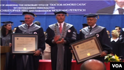 Të dy diplomatët po qëndrojnë për një vizitë në Kosovë ku sot janë ndëruar me titullin doktor “honoris causa” nga Universiteti i Prishtinës, për rolin e tyre në sjelljen e paqes dhe lirinë për shtetin e Kosovës.