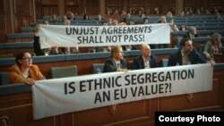 Derisa komisionari Hahn po fliste në parlament, lëvizja vetëvendosje shpalosi parullat në të cilat shkruhej: "A është segregacioni etnik vlerë e BE-së?!" dhe "Marrëveshjet e padrejta nuk do të kalojnë!"