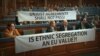 Ndërsa komisioneri Hahn fliste në parlament, lëvizja Vetëvendosje shpalosi disa parulla